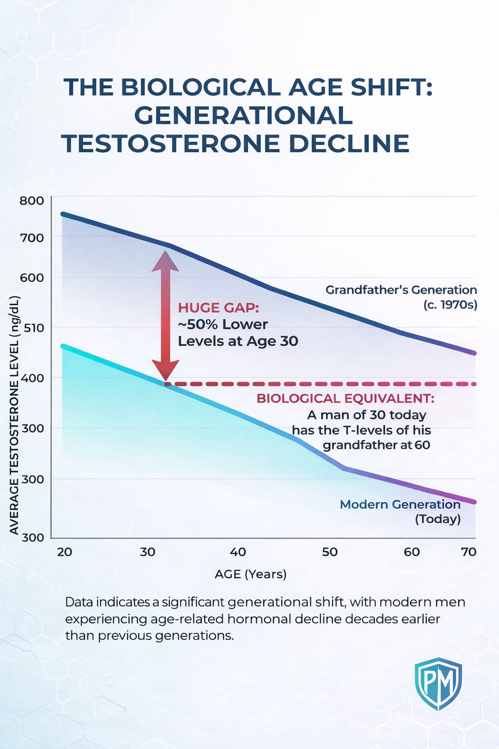 This isn't just about aging. Male testosterone levels have declined 1% per year across the entire population since the 1980s—independent of age. A 30-year-old man today has roughly 20-30% lower testosterone than a 30-year-old man in 1980.